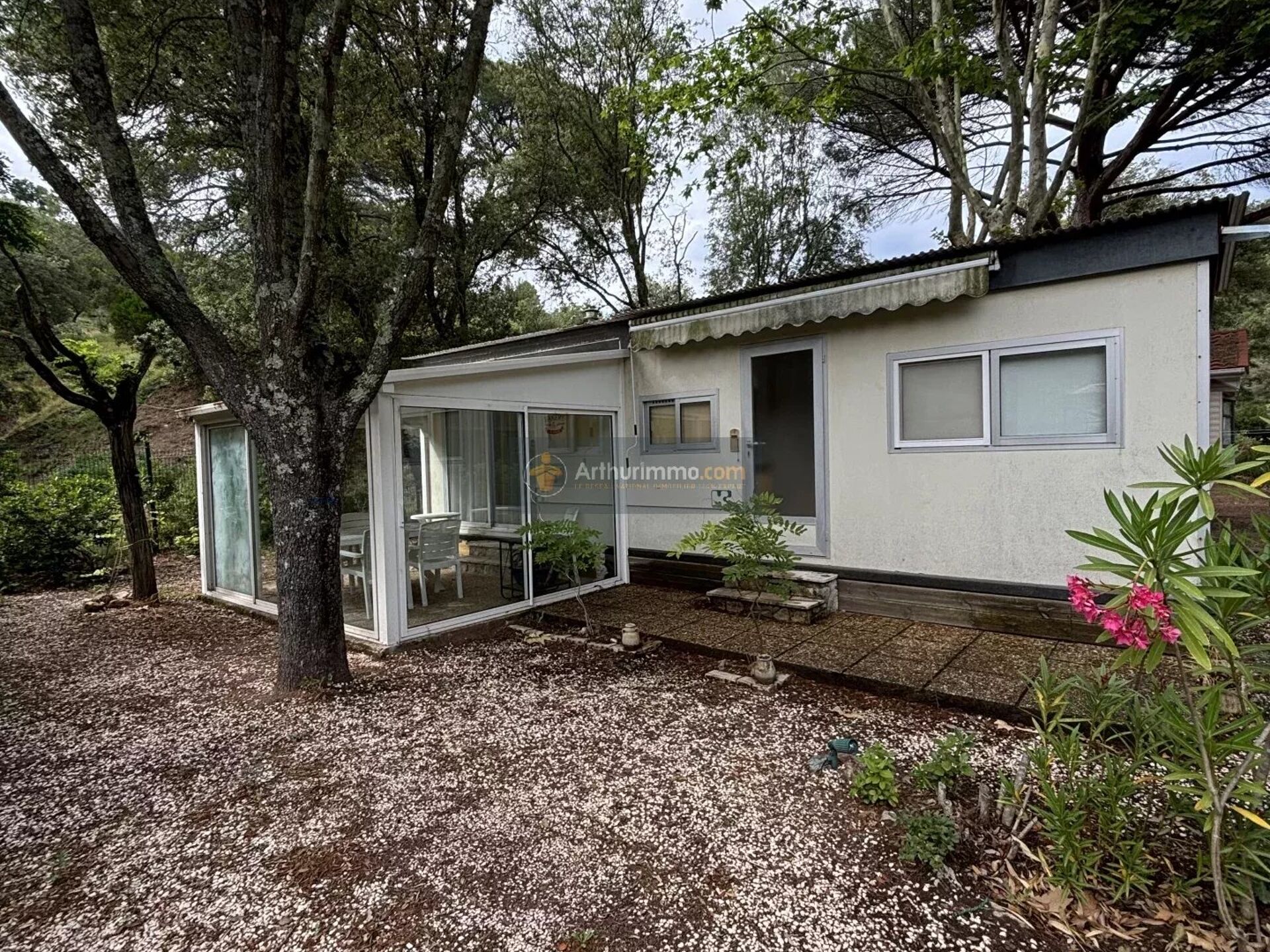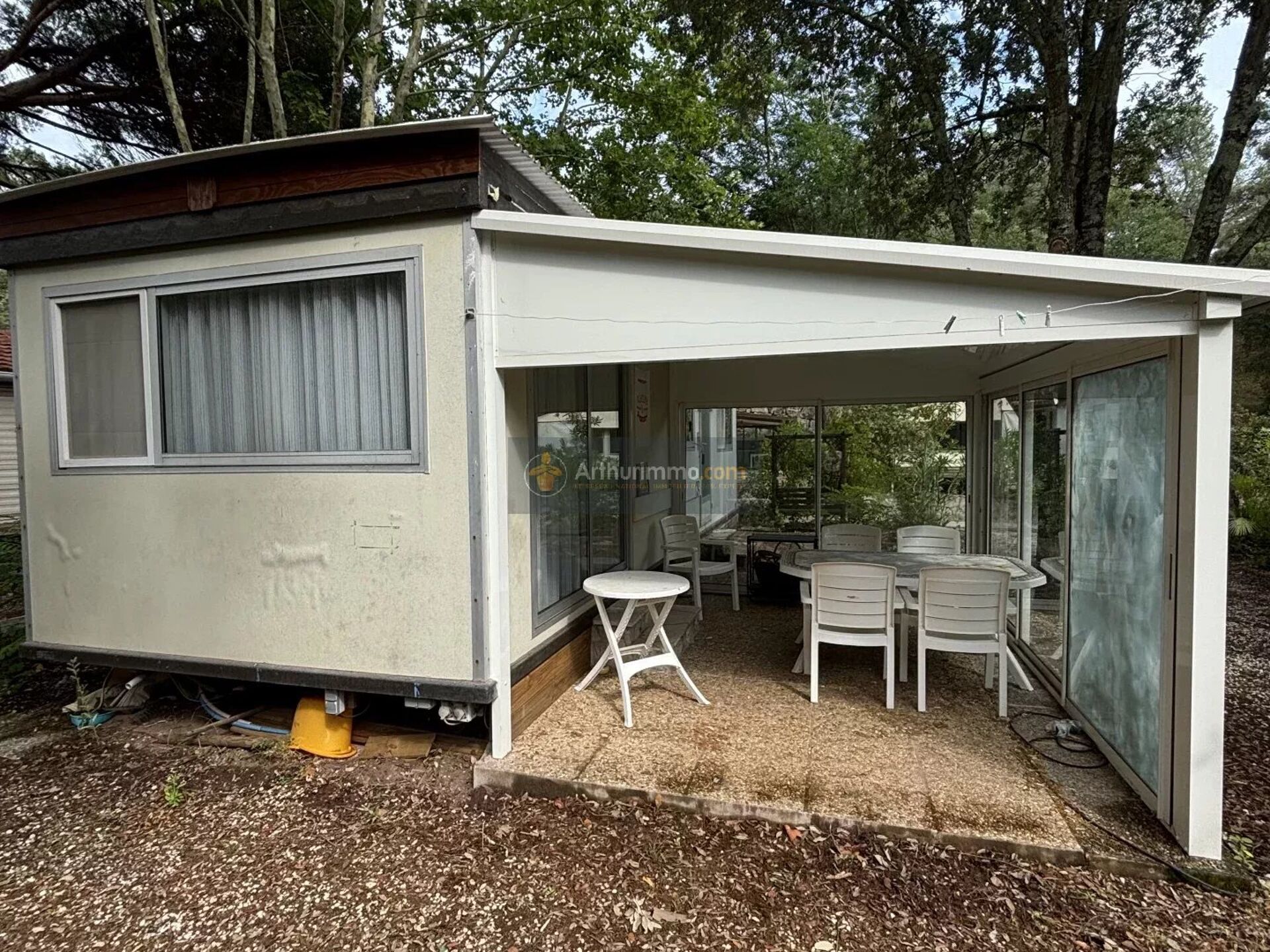MOBIL-HOME COMPOSE D'UNE TERASSE CARRELEE AVEC COIN REPAS.