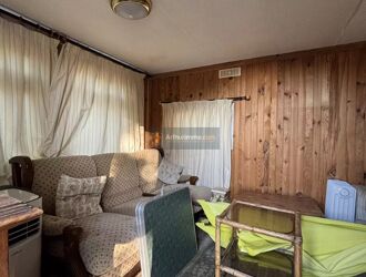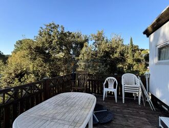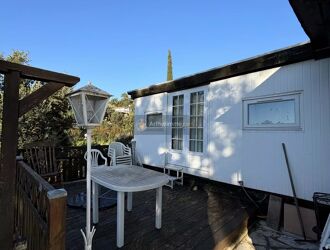 TERRAIN PLAT COMPRENANT UN MOBIL-HOME AVEC UNE JOLIE TERRASSE EN BOIS. COMPOSE D'UN COIN SALON, COIN REPAS AINSI QUE D'UNE CUISINE EQUIPEE AVEC BAIE VITREE DONNANT SUR LA TERRASSE.