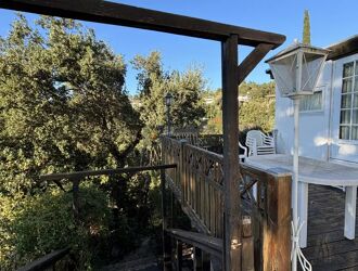 CHALET COMPOSE D'UNE TERASSE AVEC COIN SALON AVEC UNE VUE PANORAMIQUE SUR LE ROCHER DE ROQUEBRUNE.