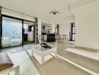 Le séjour lumineux avec cuisine ouverte équipée s’ouvre également sur la terrasse de 22 m², offrant une vue dominante et dégagée sur l’environnement.